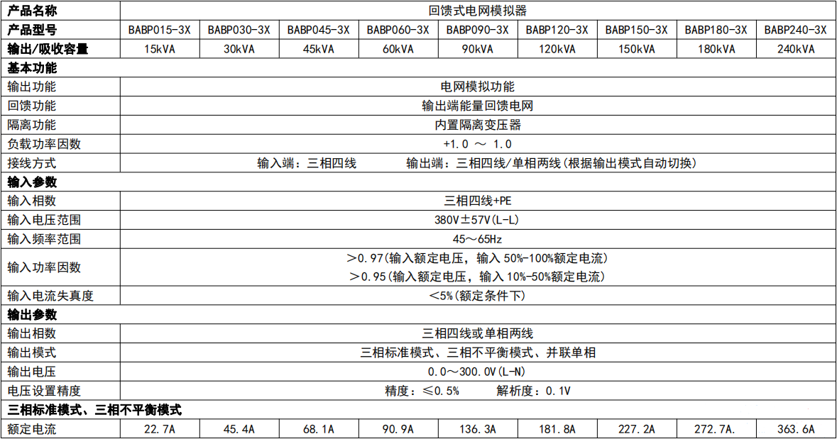BABP300-3X | 0-300V | 300kVA | 三相 | 阶梯、步阶、渐变、低(零)电压穿越 | 2-40次 | 4200×2000×1400 |