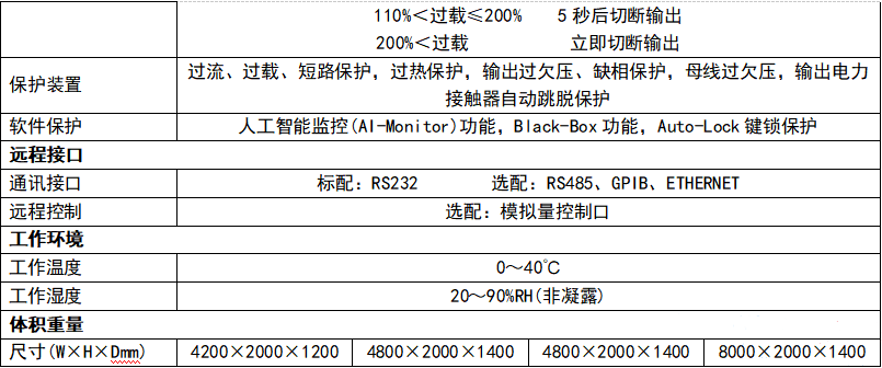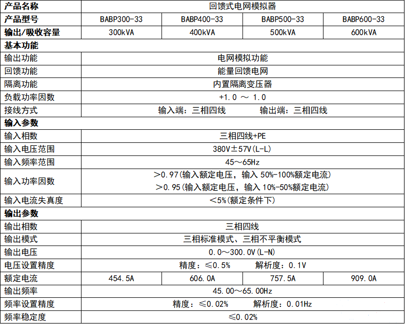 BABP500-3X | 0-300V | 500kVA | 三相 | 阶梯、步阶、渐变、低(零)电压穿越 | 4800×2000×1850 | |