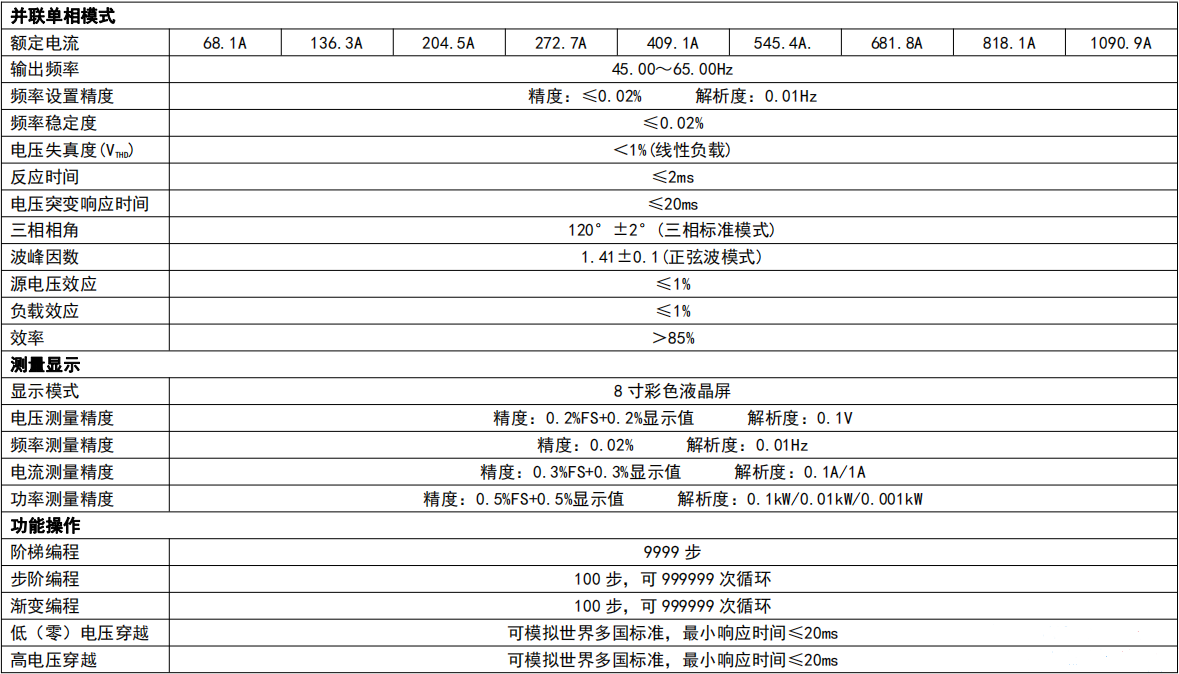 BABP030-3X | 0-300V | 30kVA | 单相/三相 | 阶梯、步阶、渐变、低(零)电压穿越 | 2-40次 | 1000×2000×800 |